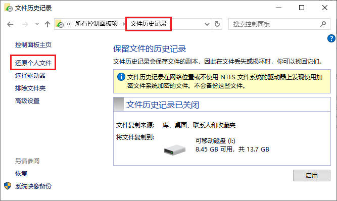 - 打开历史记录界面:在“控制面板”中,点击“文件历史记录” → 选择“还原个人文件”。