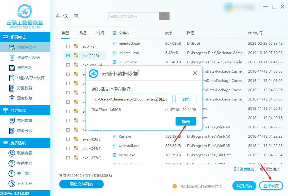 5、立即恢复文件:勾选需要恢复的exe文件,点击“立即恢复”,选择保存路径:必须存储到其他磁盘(如原文件在D盘,则保存到C盘等)。