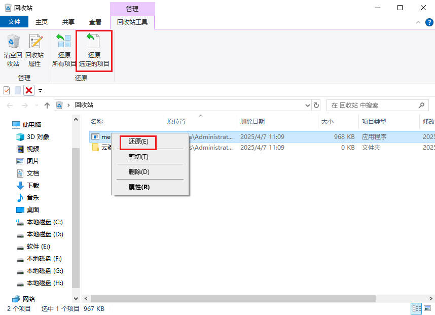 3、恢复文件:选中该文件,然后点击回收站窗口顶部的“还原选定的项目”按钮,或者右键点击文件选择“还原”。