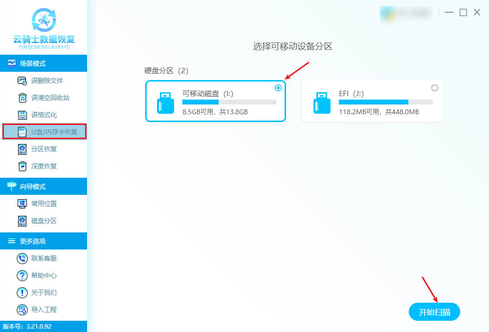 2、启动云骑士数据恢复软件→ 选择“U盘/内存卡恢复”→勾选能正常识别的U盘盘符→ 点击“开始扫描”。