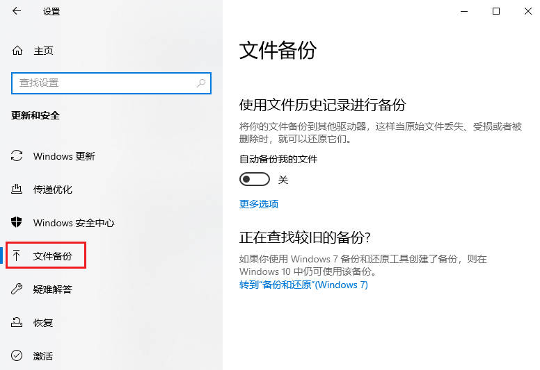 1、打开Windows设置→更新和安全→备份。