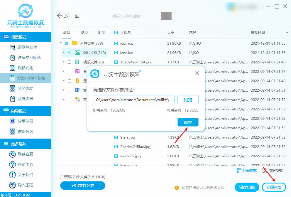 提示:优先使用“U盘/内存卡恢复”功能扫描,若无效再切换至“深度扫描”。