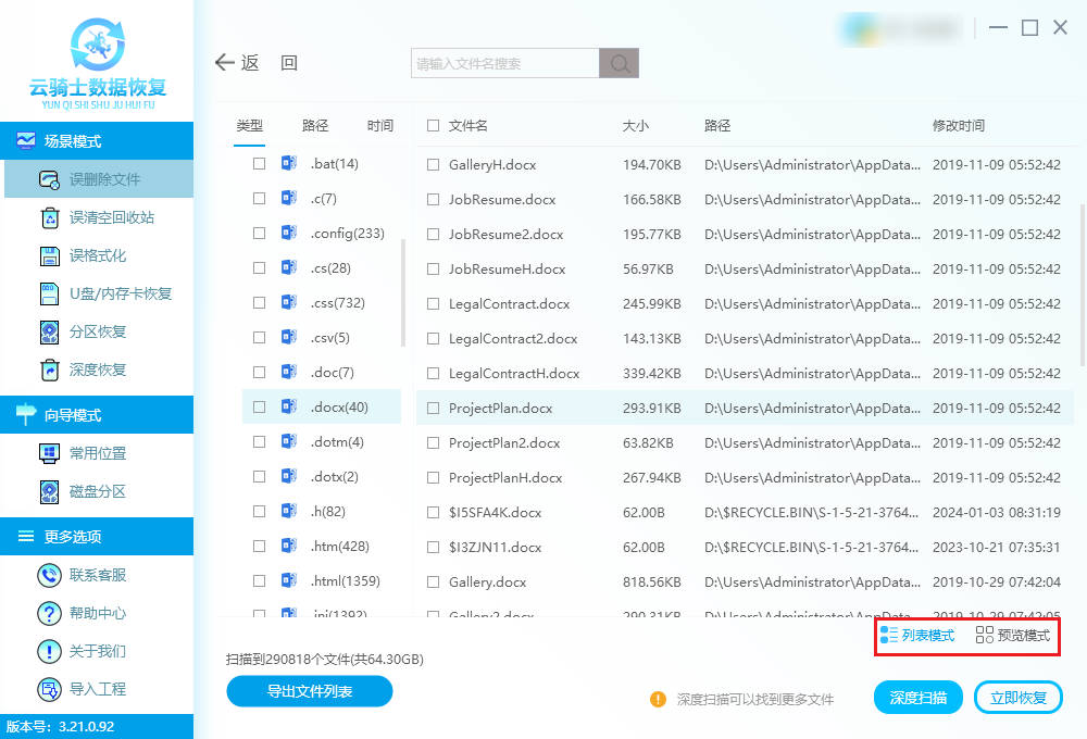 如果以上方法都无法找回文件,docx文件被误删怎么恢复?专业的数据恢复软件成为未备份者的福音,如云骑士数据恢复软件支持从误删除、误格式化、病毒感染等多种数据丢失场景中恢复文件,能够扫描硬盘、U盘、移动硬盘等存储介质,精准恢复docx、xlsx、ppt等Office文档。具体操作指南如下: