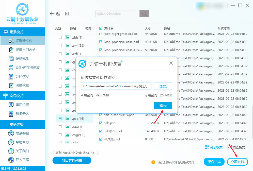 步骤4:确认无误后勾选上,点击“立即恢复”,选择恢复文件的保存位置(不要保存在原分区)即可。