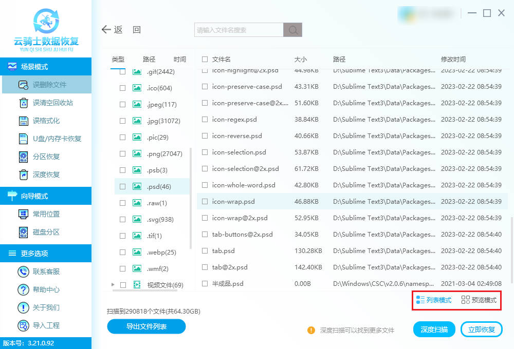 步骤3:扫描完成后,在“列表模式”中查找目标PSD文件,然后“预览模式”预览文件。
