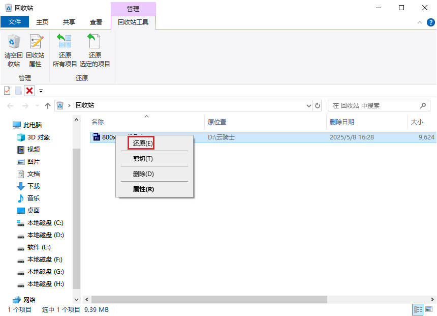 步骤3:找到目标文件后右键点击,选择“还原”文件将恢复到被删除前的位置。