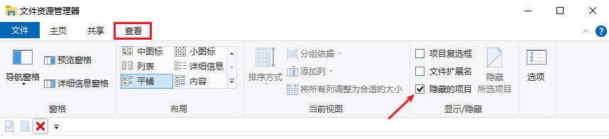 步骤2:点击顶部菜单“查看”→勾选“隐藏的项目”。