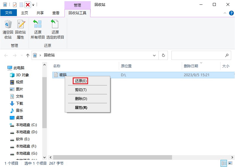 步骤3:右键点击文件选择“还原”,文件将自动恢复到原始位置。