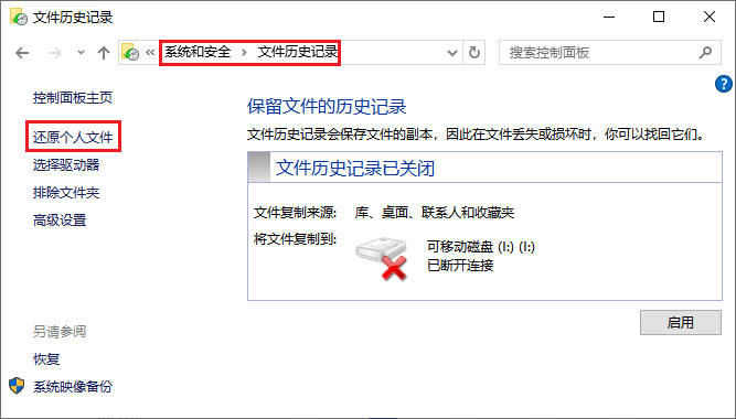 - 打开控制面板>系统和安全>文件历史记录,点击左侧“还原个人文件”。