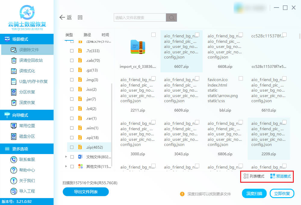 - 等待扫描完成以后,在结果列表中通过列表模式筛选.zip文件,找到后双击或通过“预览模式”预判文件可恢复性。