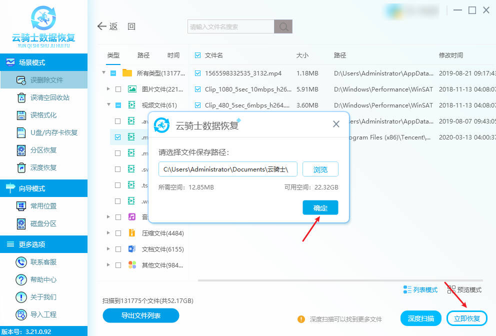 高清mp4视频文件丢失能恢复吗?当没有备份习惯,且回收站中找不到文件时,MP4视频文件恢复软件是通用有效的解决方案。如专业的云骑士数据恢复软件能够扫描存储设备的底层数据,寻找被标记为“可覆盖”但尚未被新数据覆盖的文件痕迹,适用于误删除、误格式化等原因导致的MP4文件丢失情况。支持多种存储介质(硬盘、U盘、 SD卡等)和多种视频格式的恢复。