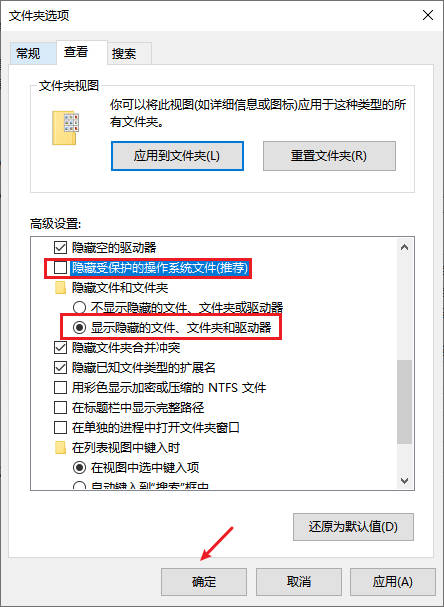 在“查看”选项卡中,选择“显示隐藏的文件、文件夹和驱动器”,取消勾选“隐藏受保护的操作系统文件”,点击“确定”。