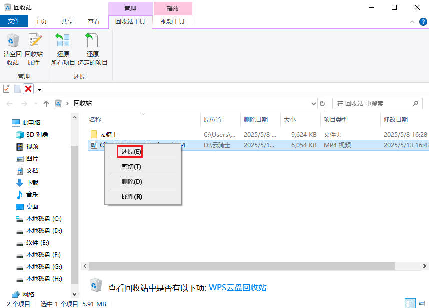 右键点击目标MP4文件,选择“还原”选项,文件将恢复到原始位置。
