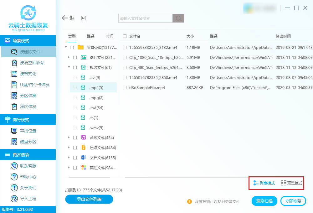 扫描完成后,可以使用“列表模式”筛选功能快速定位视频文件,然后通过双击或“预览模式”预判文件可恢复性有多少。