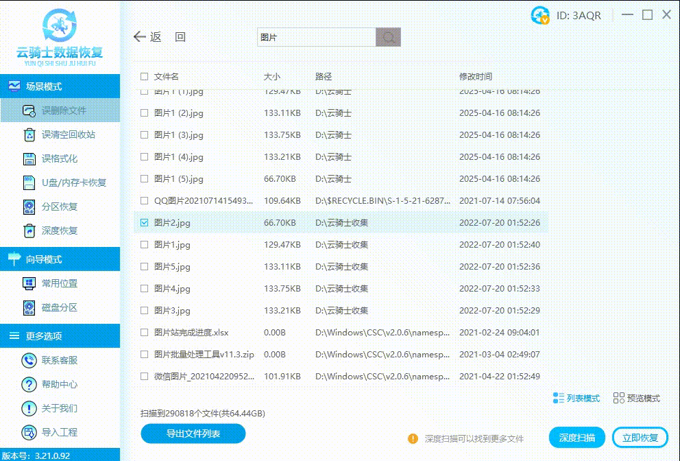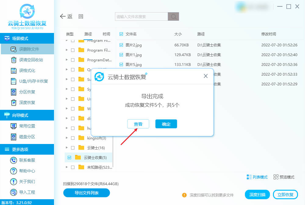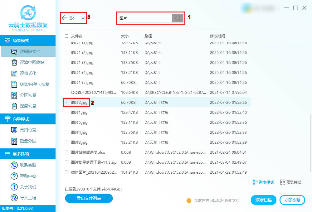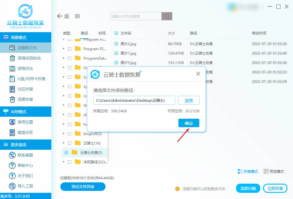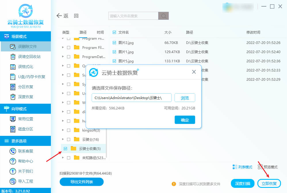 如果没有备份,文件夹图片删除能恢复吗?关键是要立即停止对磁盘的所有写入操作——包括保存新文件、修改现有文件或安装程序,防止数据被覆盖。之后,使用专业软件(如云骑士数据恢复软件)扫描原分区,尝试找回丢失但未覆盖的图片。