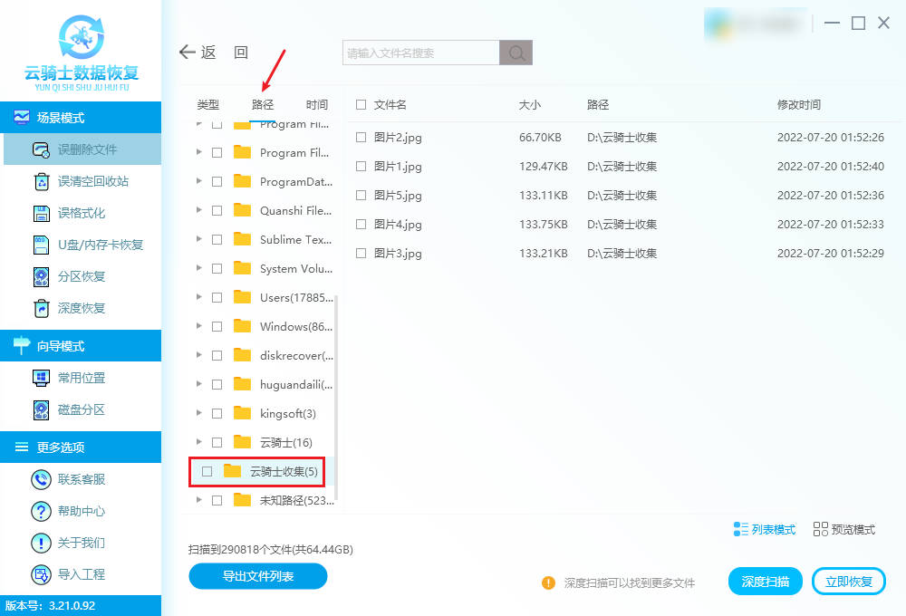 4、扫描完成以后,为了给大家看恢复效果,会使用路径查找方式来恢复文件夹图片:点击“路径”,依次按文件夹原路径(D:\云骑士收集)进行查找。