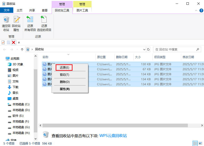 2、在回收站中找到被删除的图片文件(可通过名称、原位置、删除日期等)。