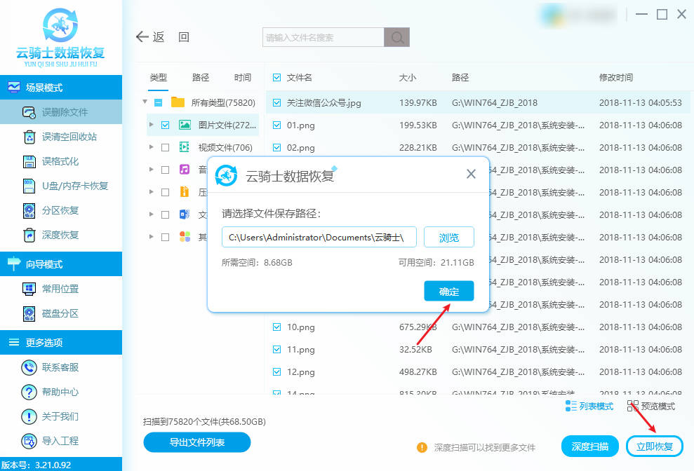 从官网下载云骑士数据恢复软件,安装到非G盘的其他磁盘,启动软件后,根据需求选择场景模式,如「误删除文件」。