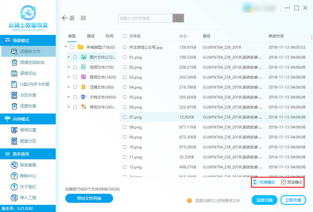 扫描完成以后,记得通过「列表模式」筛选一下所需文件,然后通过「预览模式」免费预览。