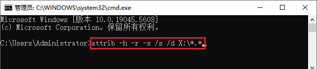- 输入命令并回车,显示所有隐藏文件:「attrib -h -r -s /s /d X:\*.*」(X替换为目标盘符)。