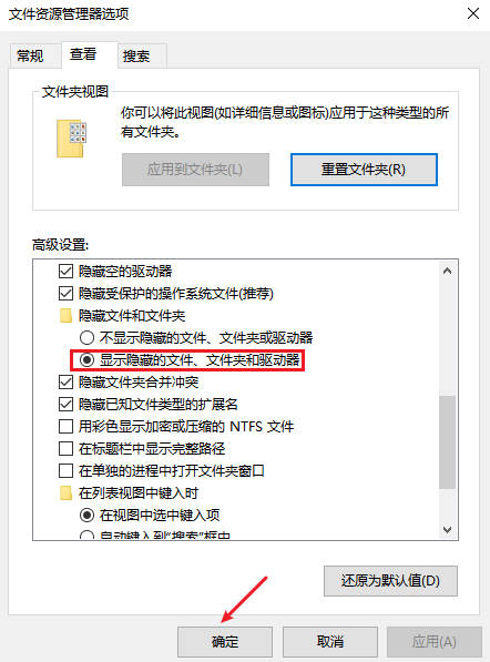 - 在「查看」选项卡中选择「显示隐藏的文件、文件夹和驱动器」点击「确定」。