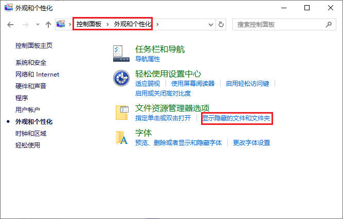 - 按「Win+S」搜索「控制面板」→「外观和个性化」→「显示隐藏的文件和文件夹」。