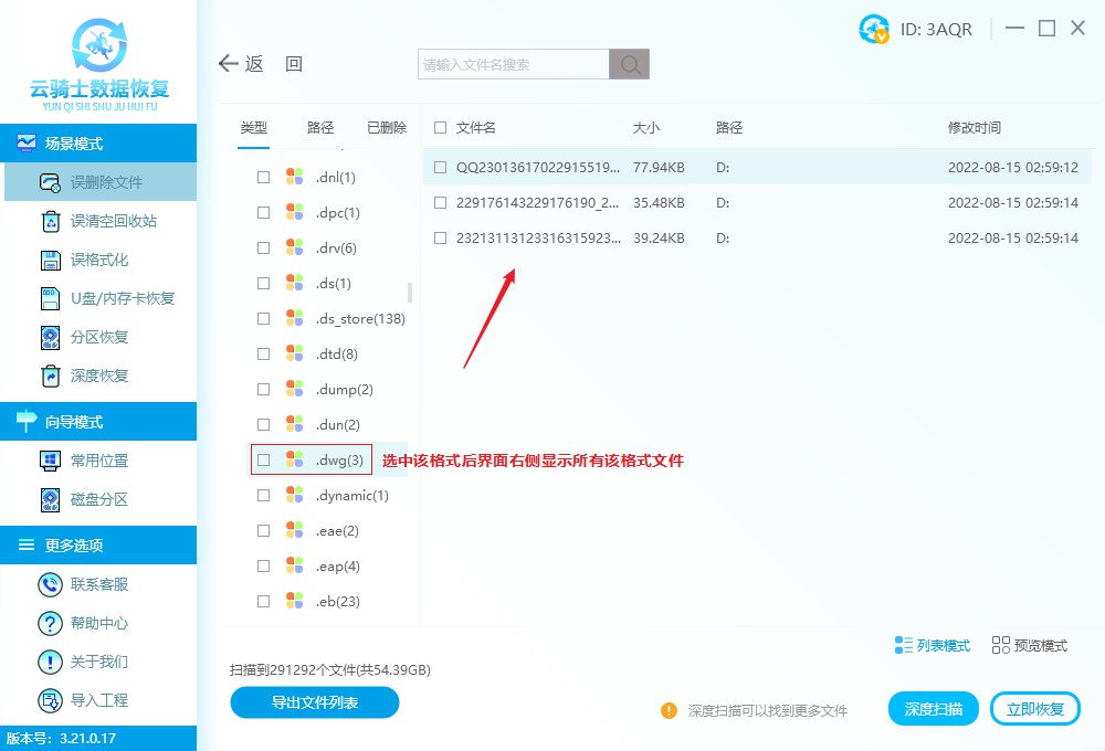 步骤3:扫描完成后,在“其他文件”类型下,筛选出DWG格式文件并预览。