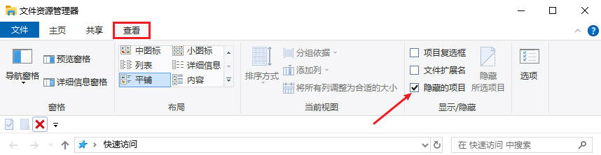 步骤1:打开文件资源管理器,点击“查看”>勾选“隐藏的项目”。
