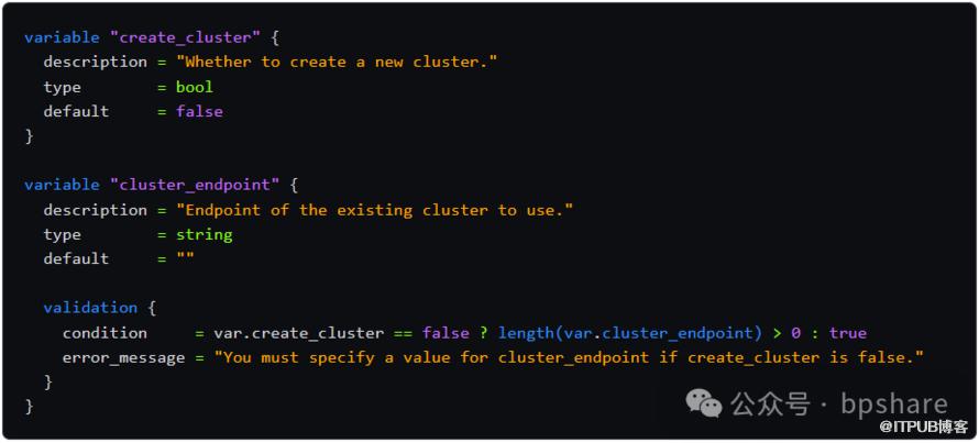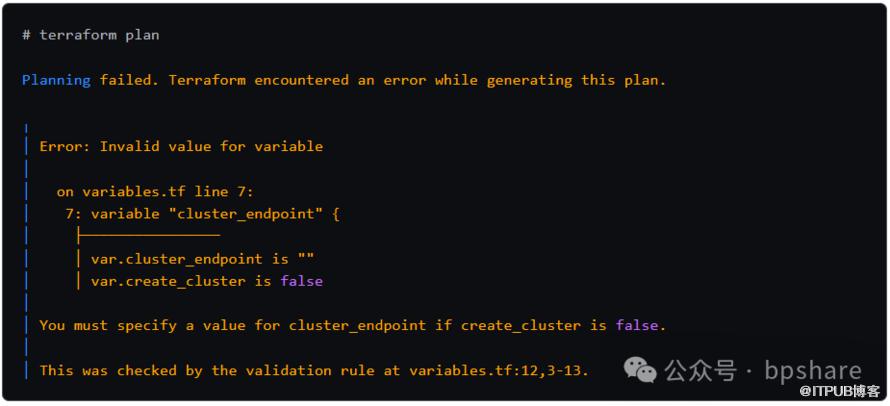 如果用户尝试使用 create_cluster = false 执行此Terraform配置,并且没有为 cluster_endpoint 提供值,他们将遇到验证错误: