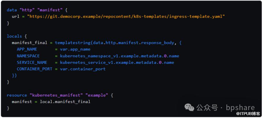 这个函数最常见的用例是使用数据源从外部位置检索模板,进行转换,然后将其传递给另一个资源。此示例从HTTP位置检索Kubernetes资源清单模板,注入一些输入变量和资源引用,并在 kubernetes_manifest 资源中引用它: