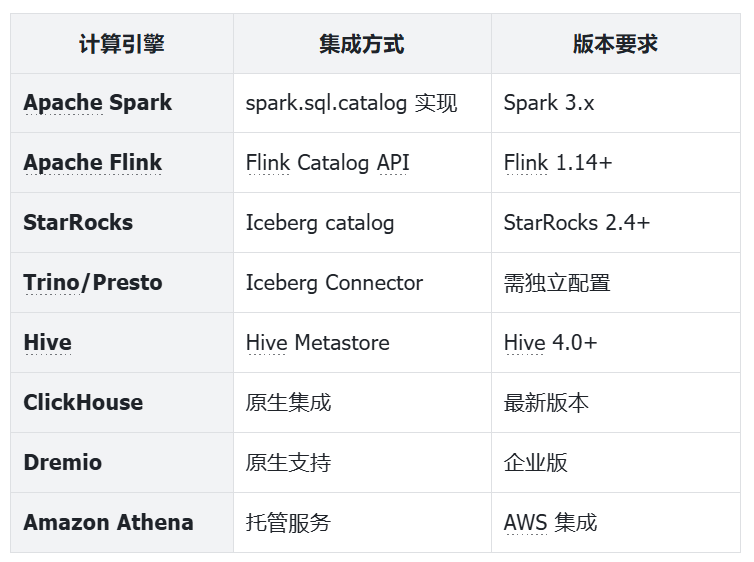 Iceberg 与多种主流计算引擎(如 Apache Spark、StarRocks、Amazon Athena、Snowflake 等)具有良好的兼容性,推动了数据湖技术的广泛应用。