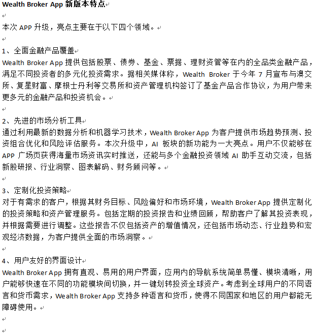 据悉,Wealth Broker 旗下互联网券商应用软件已于今年第三季度进行了全面升级。此次升级整合证券交易和财富管理功能,以其全面的金融产品覆盖、先进的市场分析工具、定制化投资策略和用户友好的界面设计,成为投资者的新宠。