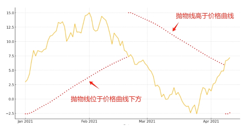 当抛物线在价格下方时,表示市场处于上升趋势。而抛物线在价格上方时,则代表市场是处于下降趋势的。