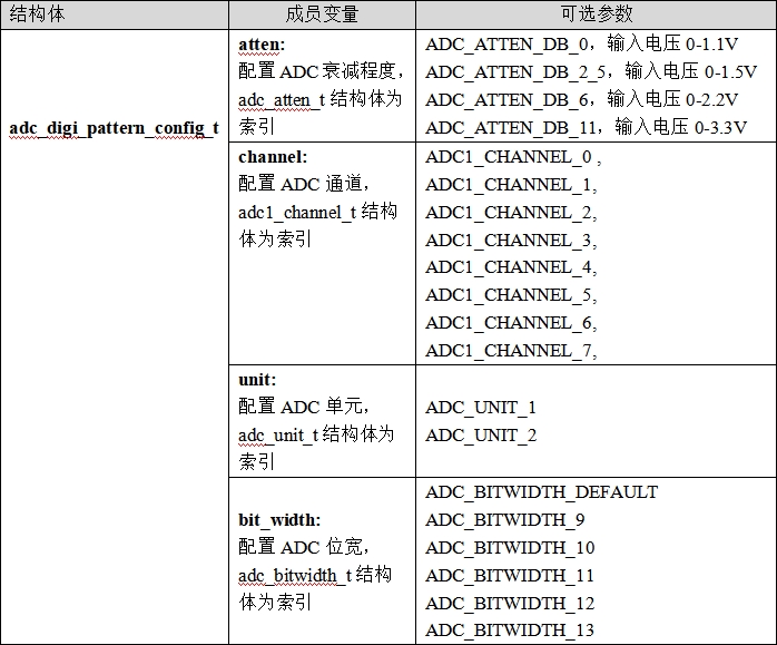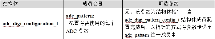 该函数使用adc_digi_pattern_config_t以及adc_digi_configuration_t类型的结构体变量传入,该结构体的定义如下所示: