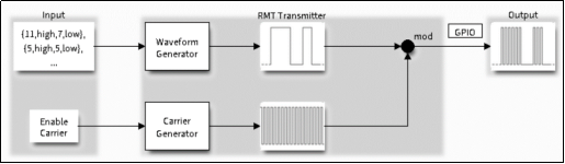 驱动程序将用户数据编码为RMT数据格式,随后有RMT发 射 器根据编码生成波形。再将波形发送至GPIO引脚,发 射 器还可以提供载波,并调制高频载波信号。