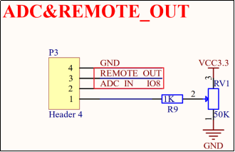需要注意:REMOTE_OUT并没有直接与ESP32-S3芯片的引脚相连,而是需要在P3端口处使用跳线帽将REMOTE_OUT和ADC_IN连接起来,P3端口的原理图以及实物连接方式如下所示: