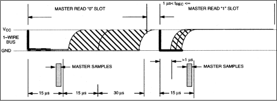 单总线器件仅在主机发出读时序时,才向主机传输数据,所以,在主机发出读数据命令后,必须马上产生读时序,以便从机能够传输数据。所有读时序至少需要60us,且在2次独立的读时序之间至少需要1us的恢复时间。每个读时序都由主机发起,至少拉低总线1us。主机在读时序期间必须释放总线,并且在时序起始后的15us之内采样总线状态。典型的读时序过程为:主机输出低电平延时2us,然后主机转入输入模式延时12us,然后读取单总线当前的电平,然后延时50us。