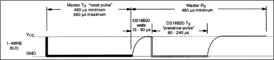 单总线上的所有通信都是以初始化序列开始。主机输出低电平,保持低电平时间至少要在480us,以产生复位脉冲。接着主机释放总线,4.7K的上拉电阻将单总线拉高,延时时间要在15~60us,并进入接收模式(Rx)。接着DS18B20拉低总线60~240us,以产生低电平应答脉冲。