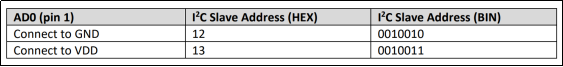 从上图可知,当第1号管脚(AD0)拉低时,QMA6100P设备地址被设置为0x12,反次,该设备地址为0x13。本开发板是把AD0管脚拉低,所以在QMA6100P设备地址为0x12。