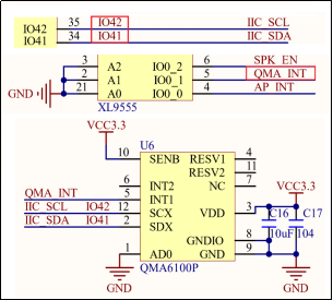 根据上文,QMA6100P三轴加速度计支持SPI和IIC两种通信接口。接口的实现流程可参考《13-52-20 QMA6100P Datasheet Rev. D.pdf》数据手册。本章节以ESP32-S3开发板电路为基准,该开发板使用IIC通信接口来获取QMA6100P三轴加速度计的相关参数。
