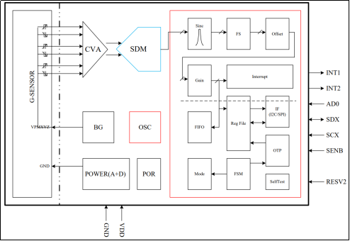 QMA6100P是一款三轴加速度传感器,具有高集成、小尺寸封装的特点。它集成了信号调节ASIC的加速度传感器,可以感知倾斜、运动、冲击和振动。QMA6100P基于先进的高分辨率单晶硅MEMS技术,配合定制设计的14位ADC专用集成电路,具有低噪声、高精度、低功耗、偏置微调等优点。它支持数字接口I2C和SPI,内置硬件计步器,支持多种不同中断模式。QMA6100P的最大可支持64级FIFO,待机电流为5μA,计步器工作电流为44μA。主要应用市场与优势是手机,手环,手表,各类低功耗IOT设备,集成各类应用算法,计步器,抬手亮屏,垂手亮屏,久坐提醒,跌倒报警,跌落报警,睡眠检测,平衡检测,倾斜检测,睡眠唤醒等超过20种不同应用。QMA6100P还具有低成本和与市场主流传感器兼容的优点,以及超低功耗、可靠性高的特点。下图是QMA6100P内部框图。