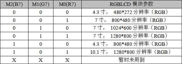这样我们在程序里面,读取 LCD_R7/G7/B7,得到 M0:M2 的值,从而判断 RGBLCD 模块的型号,并执行不同的配置,即可实现不同 LCD模块的兼容。