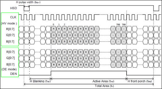 从图中可以看出,DE和HV模式,时序基本一样,DEN模式需要提供DE信号(DEN),而HV模式,则无需DE信号。图中的HSD即HS信号,用于行同步,注意:在DE模式下面,是可以不用HS信号的,即不接HS信号,液晶照样可以正常工作。