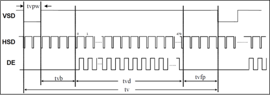 图中的VSD就是垂直同步信号,HSD就是水平同步信号,DE为数据使能信号。如图可知,一个垂直扫描,刚好就是480个有效的DE脉冲信号,每一个DE时钟周期,扫描一行,总共扫描480行,完成一帧数据的显示。这就是800*480的LCD面板扫描时序,其他分辨率的LCD面板,时序类似。