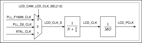 其中,MO由寄存器LCD_CAM_LCD_CLK_EQU_SYSCLK和LCD_CAM_LCD_CLKCNT_N决定。最终我们得到了LCD_PCLK时钟,该时钟经过分频得到了像素时钟 LCD_PCLK。