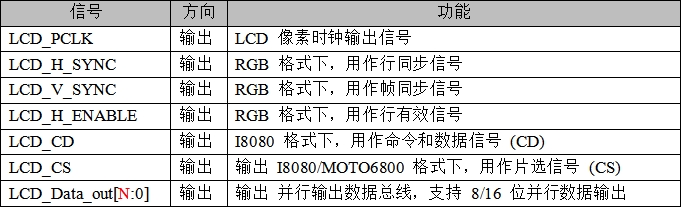 LCD模块信号对应了上图右下角的几个信号,它们的具体作用如下所示。