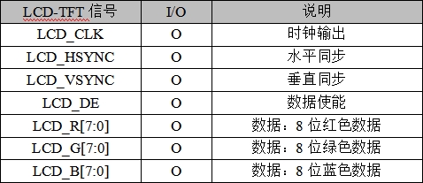 一般的RGB屏都有如表33.1.1.1所示的信号线,有24根颜色数据线(RGB各8根,即RGB888格式),这样可以表示最多1600W色,DE、VS、HS和DCLK,用于控制数据传输。