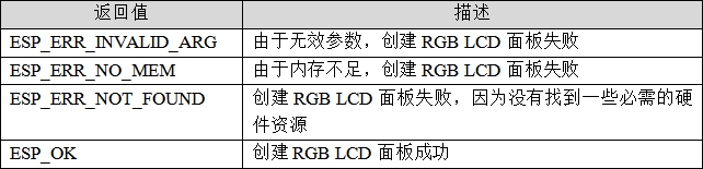 表33.3.2.2 函数esp_lcd_new_rgb_panel ()返回值描述