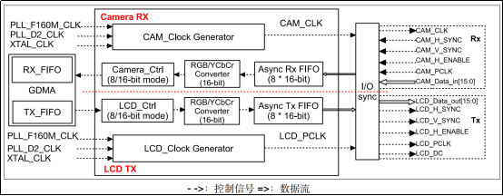 这个系统的LCD模块(即上图的下方部分)包括以下模块:一个独立的发送控制单元(LCD_Ctrl),用于控制LCD的发送;一个发送异步FIFO(Async Tx FIFO),用于与外部设备交互,发送数据;一个LCD_Clock Generator时钟生成模块,用于生成对应模块的时钟;以及一个格式转换模块,即RGB/YCbCr Converter,用于各种格式的视频数据互相转换。这些模块协同工作,确保系统能够高效、稳定地处理和传输并行视频数据信号。