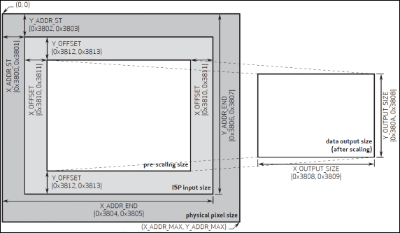 该设置允许用户设置整个传感器区域(physical pixel size ,2632*1951)的感兴趣部分,也就是在传感器里面开窗(X_ADDR_ST、Y_ADDR_ST、X_ADDR_END和Y_ADDR_END),开窗范围从0*0~2632*1951都可以设置,该窗口所设置的范围,将输入ISP进行处理。